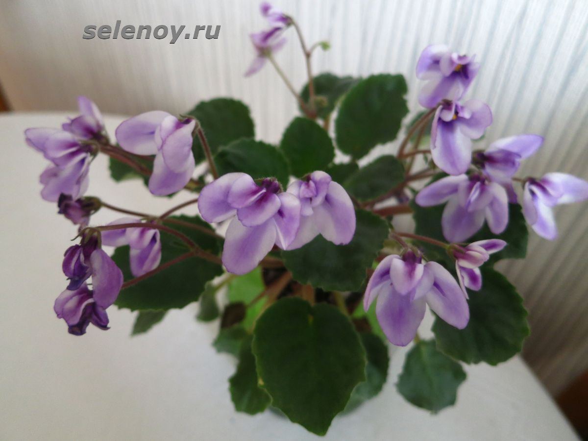 Pony Ride 11/07/1991 (7590) (LLG) Цветы – сине-голубые колокольчики с белой полоской по центру лепестков. Розетка быстро растёт, легко образует отростки. Листва светло-зелёная. Компактный миниатюрный трейлер. |